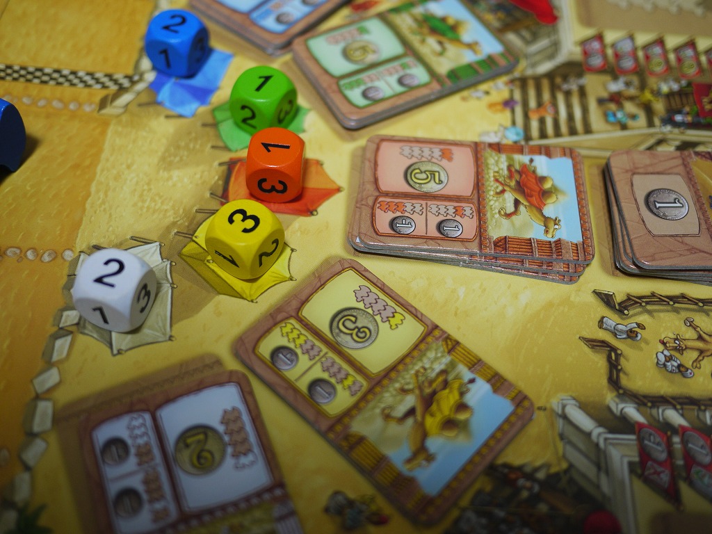 準備段階で各色のサイコロを1つずつ振り、らくだの初期位置を決める。その後3金と予想用のカード、オアシスタイルを受け取り、ゲームスタート!