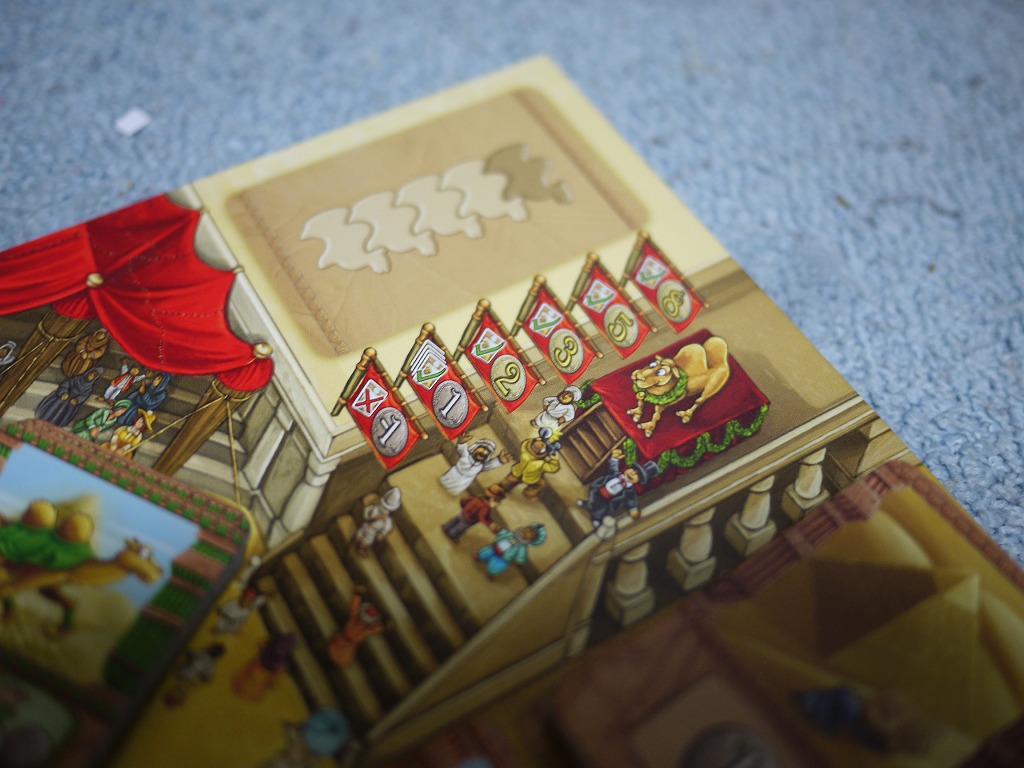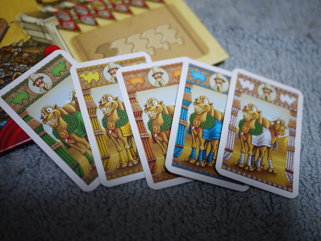 こうしてレグを繰り返していき、どれか1頭のらくだがゴールラインを越えたら即座にゲーム終了。最終結果のカードをめくって最終決算。一番所持金額の多い人の勝ち!