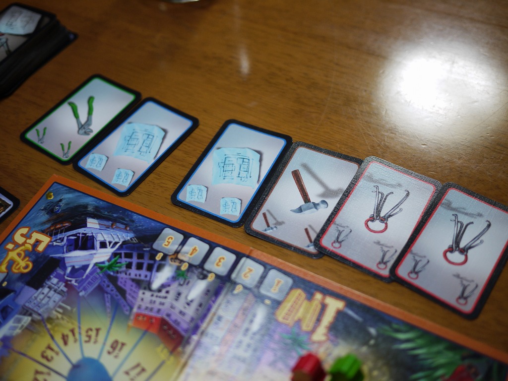 3:廃墟で道具を交換できる。最初にワーカーをおいた人は1枚捨て札にして2枚ゲット。次の人は2枚捨て札にして3枚ゲット・・・ 後手番になるほど効率が下がる。