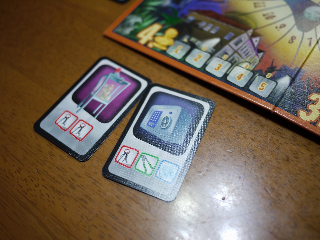 2:住宅地で盗みを働くことができる。プレイ人数に応じたお宝が並べられているので、描かれた道具を捨て札にしてカードを獲得する。道具は当然捨て札。