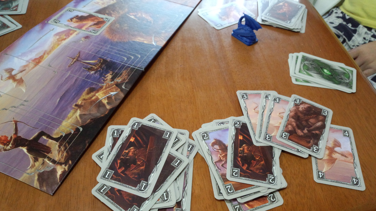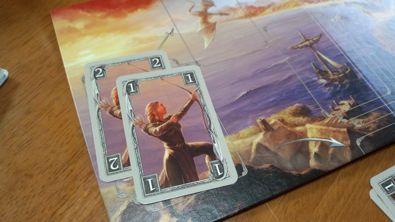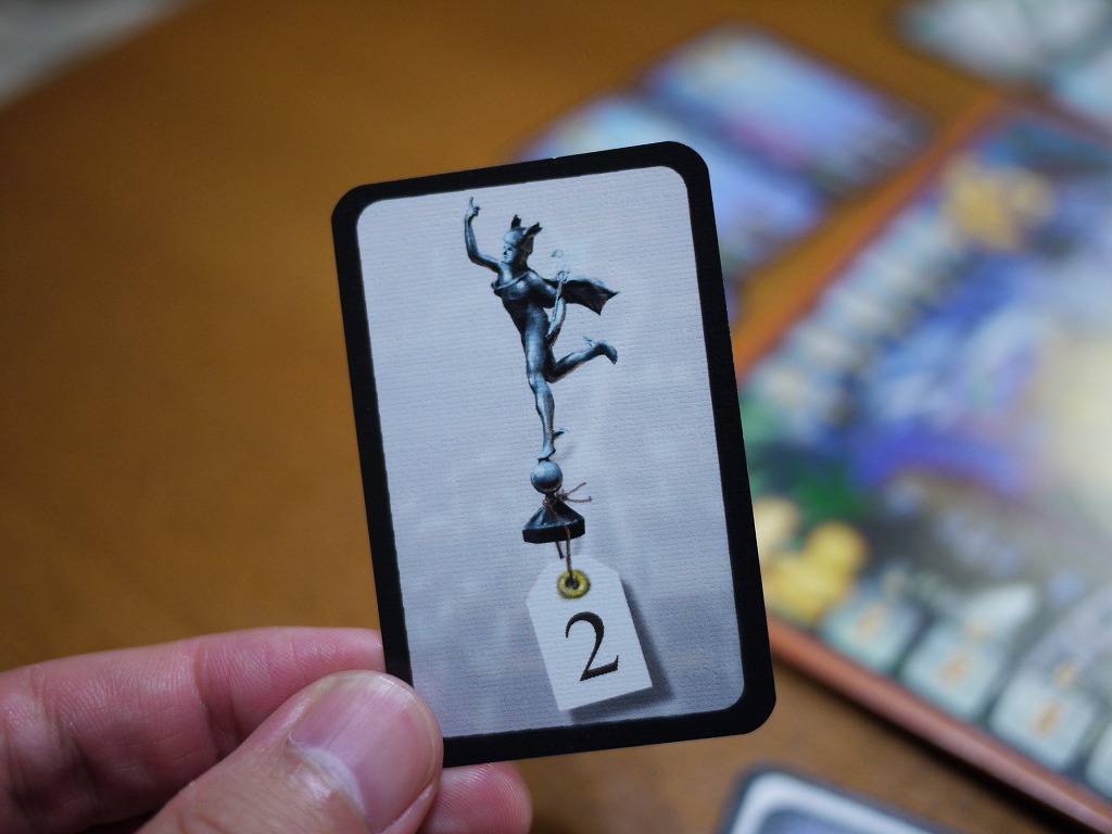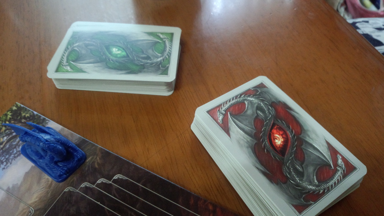 いずれかの条件でゲーム終了。獲得カードの得点を集計して点数の多いほうが勝ち!ちなみにドラゴンフィギュアを最後まで保持していたほうに+3点のボーナスが入る。たまにこれで逆転されて負ける・・・。