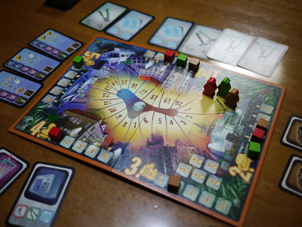 私の知る限り最も軽い「ワーカープレースメント」のゲーム。軽すぎてワカプレだと思われないほどだ。拡大再生産の要素は全然なく、道具入手→盗み→換金の流れを3人のワーカーを使って行っていくことになる。