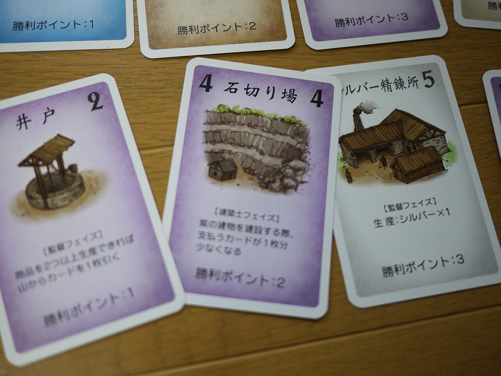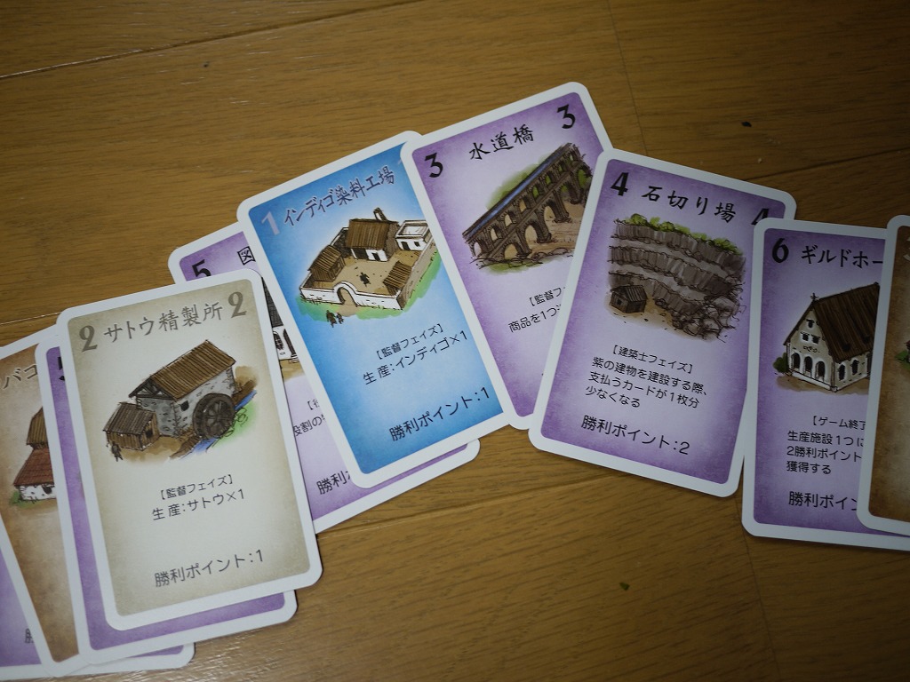 カードゲームということもあって、色々な建物が全てカードになっている。ちなみにこの建物カードが、「お金」あるいは「商品」になることもある。詳細は後述。