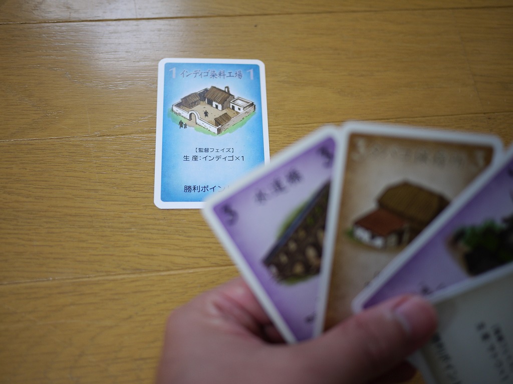 まずは各プレイヤーが「インディゴ染料工場」を一枚ずつ持ち、手札は4枚でゲームスタート。誰かが12件目の建物を建設(自分の場に出す)した時、即座にゲームが終わる。