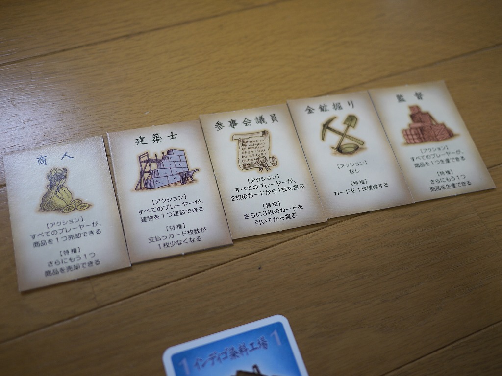 プエルトリコと同じように、各プレイヤーが役割タイルを選んでいくことでゲームが進行する。サンファンには商品を船に載せるという概念が無いので、役割は全部で5つだ。