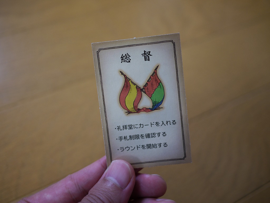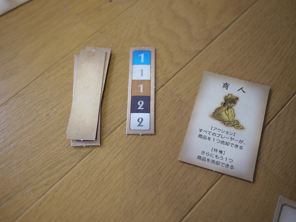 全員が役割を選んだらラウンド終了。役割タイルを戻し、スタPが左隣に移る。この時、手札が8枚以上あったら7枚以下になるまで捨て札にしなくてはならない。
