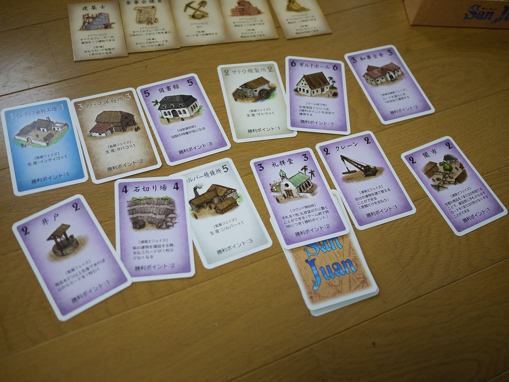 生産施設以外の「紫色の建物」は、プエルトリコ以上に種類が豊富。最終決算時に得点が入るおなじみのギルドホールといった建物以外に、特権が倍になる図書館、手札が12枚までになる塔など、様々な組み合わせのコンボが考えられると思う。