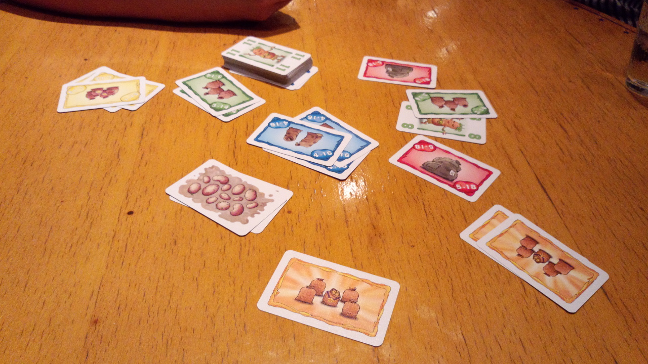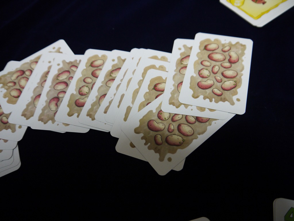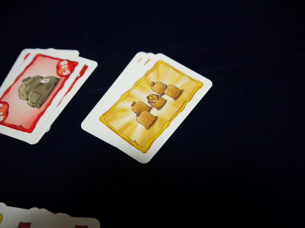 「ポテト袋カード」は各色3枚しか無いので、無くなったら代わりに「金のポテト袋カード」を取れる。これは5点と非常に強力だ。赤が枯れていれば赤スートで勝っても5点。戦略の指針と成る。