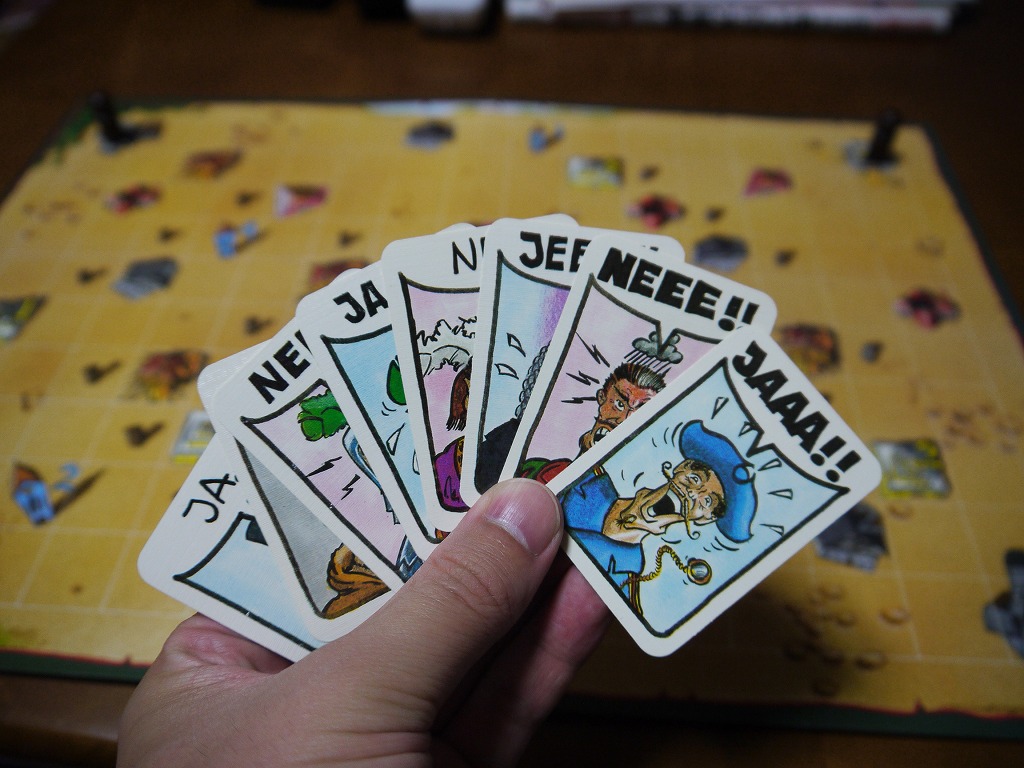 投票カードには 「JA!」(賛成)と「NE!」(反対)が有る。「A」や「E」の数が投票数。つまりどうしても反対したい!といった時は「NEEE!」のカードを出せば良い。ただし使い捨て。