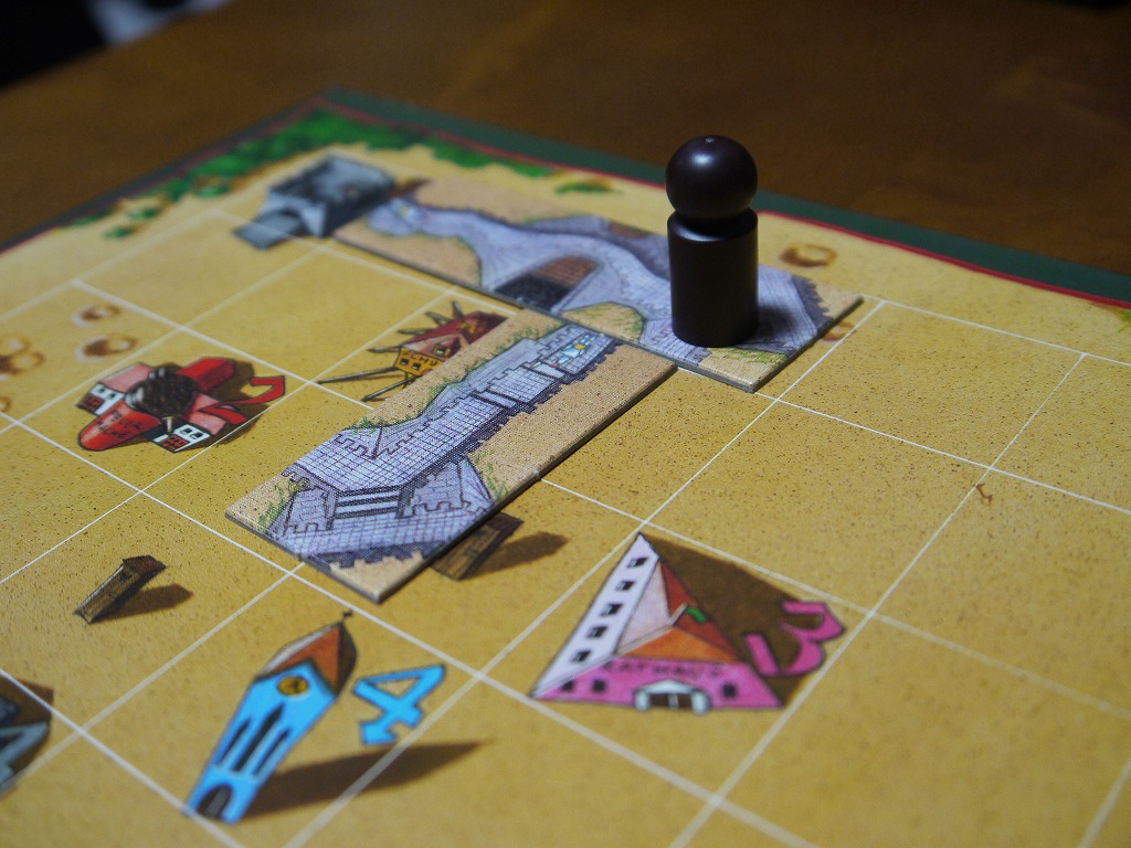 こうしてタイル配置を順番に行い、どのコマも動けなくなるか、全員の手持ちタイルが無くなったら終了。自分の色の建物で、残った建物に書いてある数字を合計する。