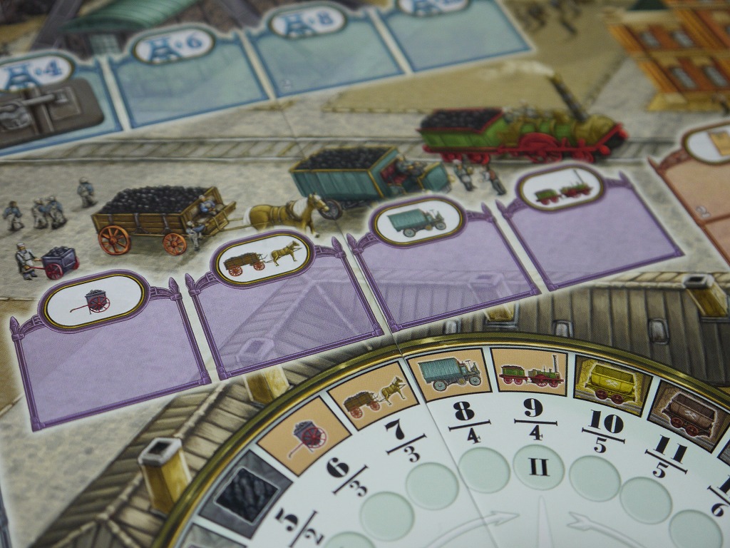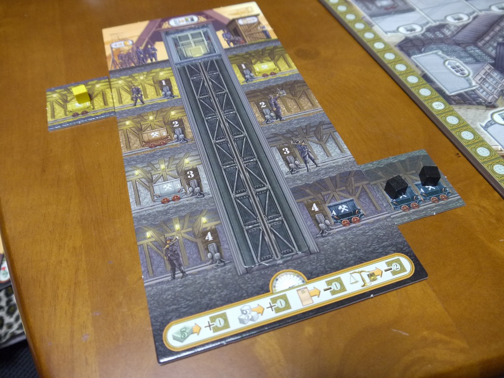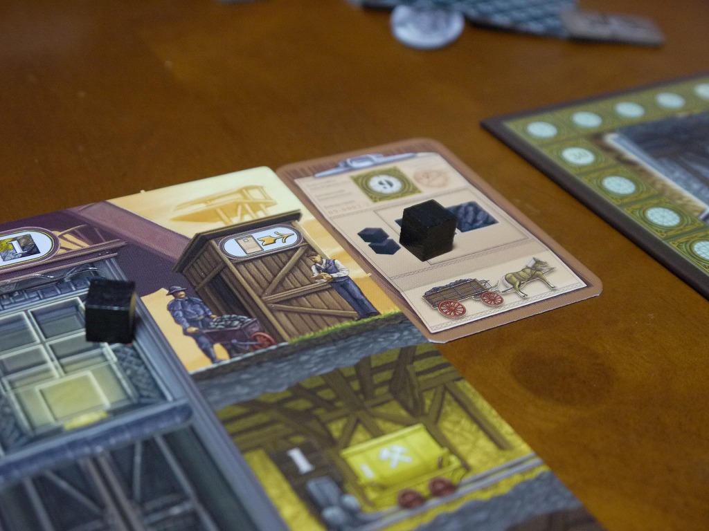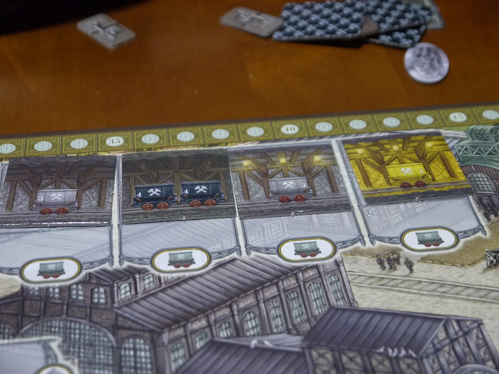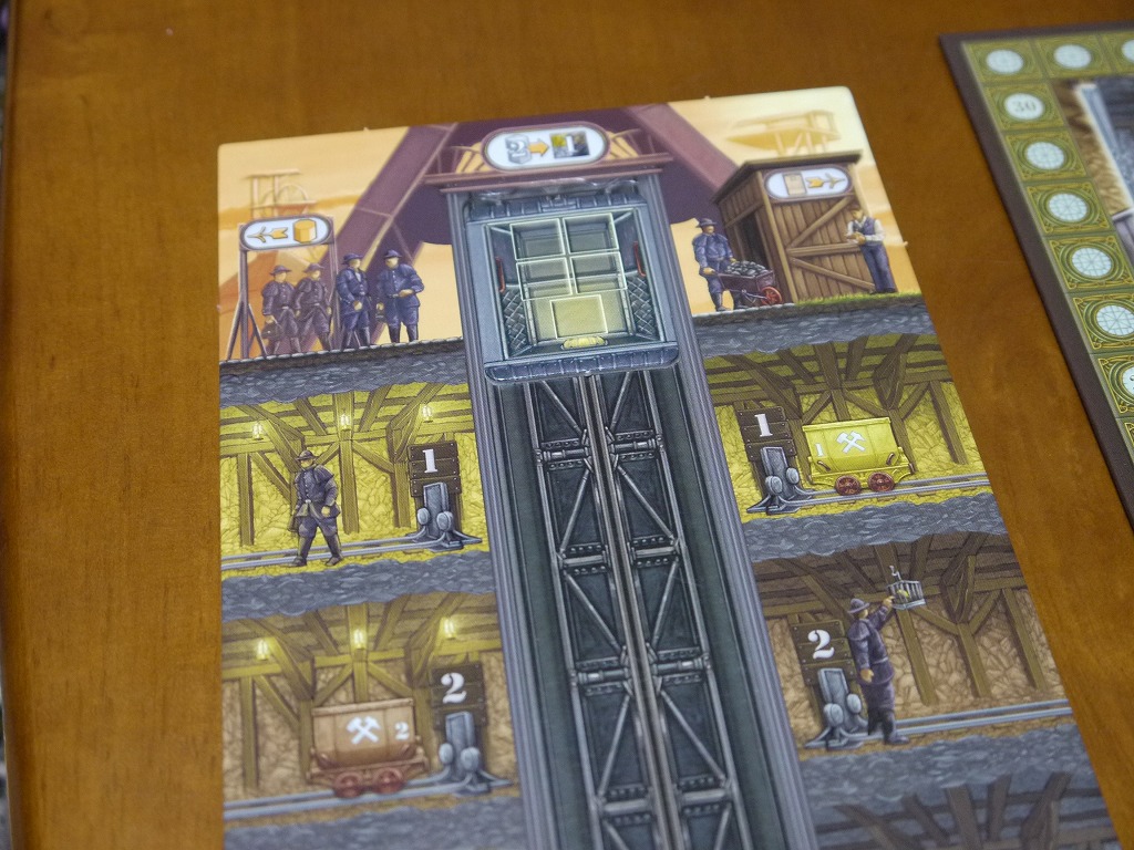 エレベータの上下や、石炭の積載、注文カードへの積載を各1アクションとして、炭鉱から石炭を取り出す。当然効率よいアクションを考えなくては行けないし、多いアクション数からワーカーが配置されていく。使い切れなかったアクションは単に廃棄される。