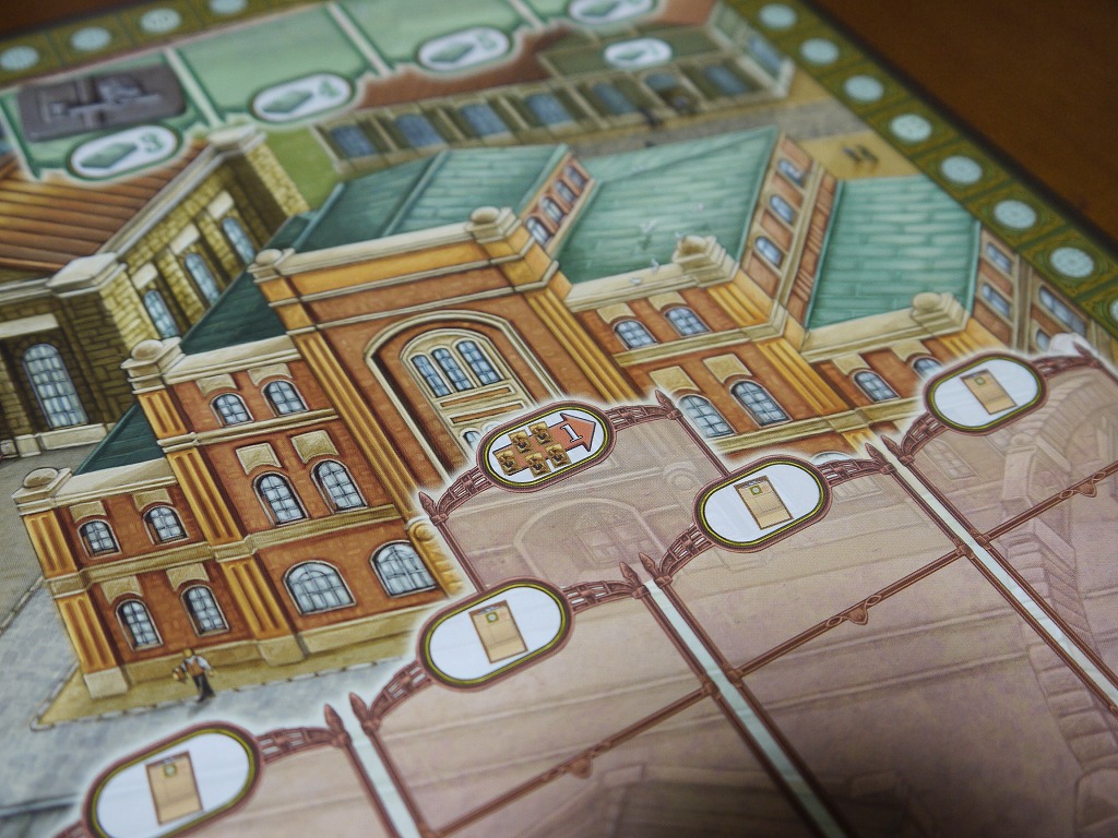 んでこちらがメインボード。まずプレイ人数によって使わないマスがあるので、そこには「鍵タイル」を置いて使用不可を示す。