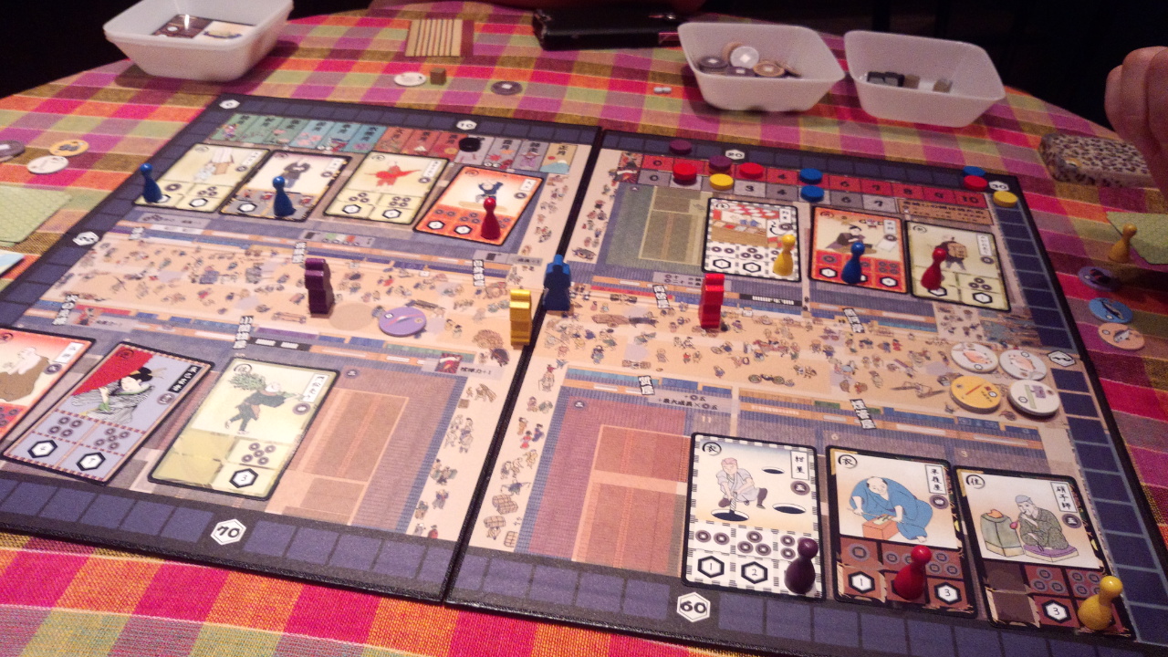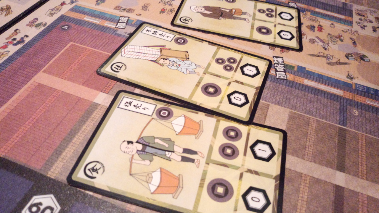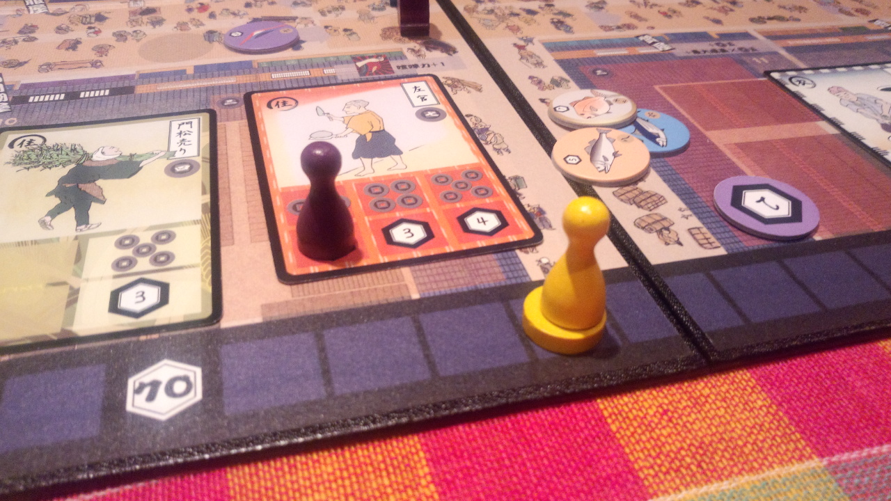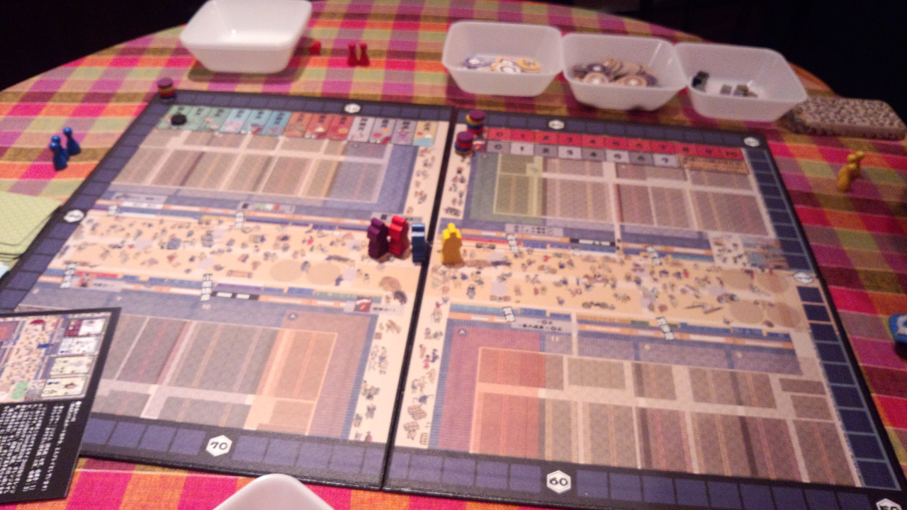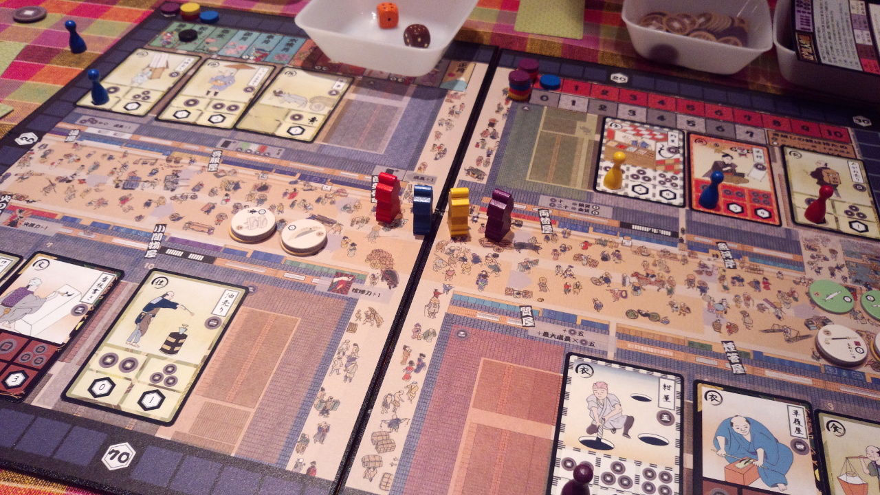 初回プレイの途中で気がついたが、出目に恵まれれば初期に「下駄」を買い(親方の移動を調節できる)、ぐるぐる親方トラックを回りながら職人レベルを上げ、豊富な資金で買い物していくプレイがひとつの理想形だと思う。あとは喧嘩力をあげて、とにかく喧嘩をふっかけるとか