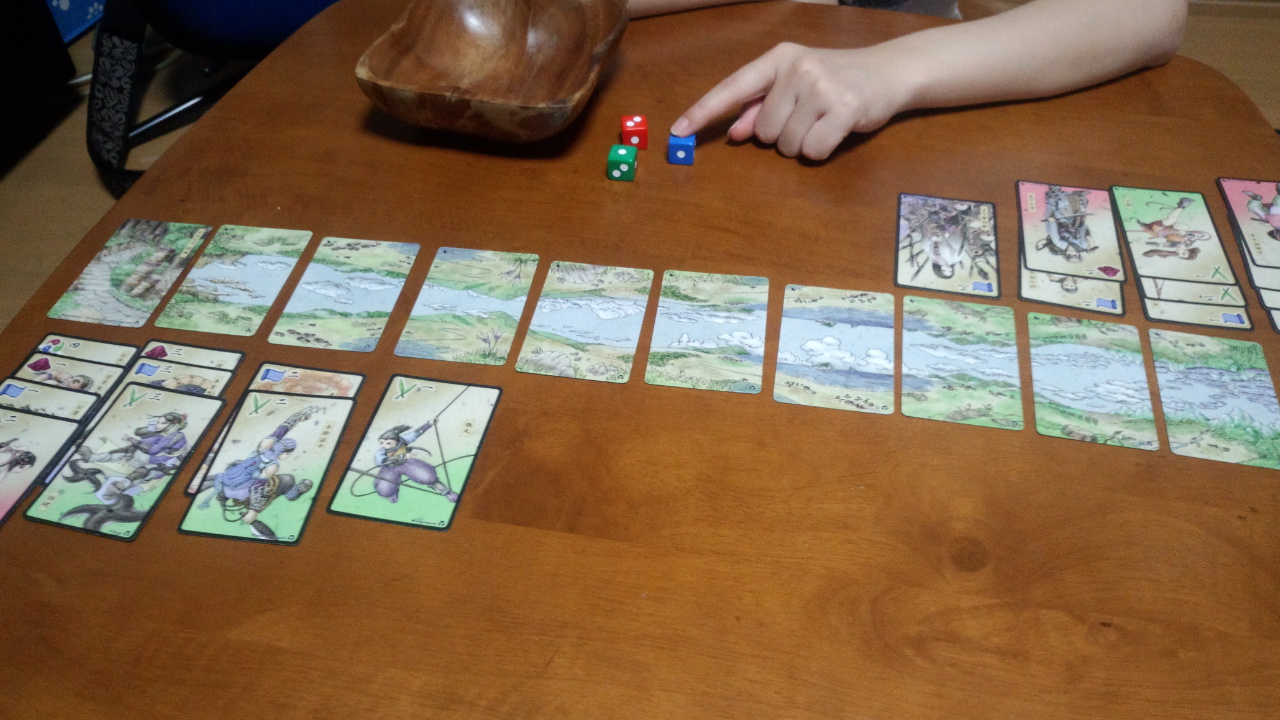 自分のプレイ環境では2人ゲームの稼働率が高いので、ゲームマーケットで購入。カードゲームだが、カードを並べて作った場の中で、忍者カードをサイコロで動かす。カードというか、「駒」のように扱うのだ。