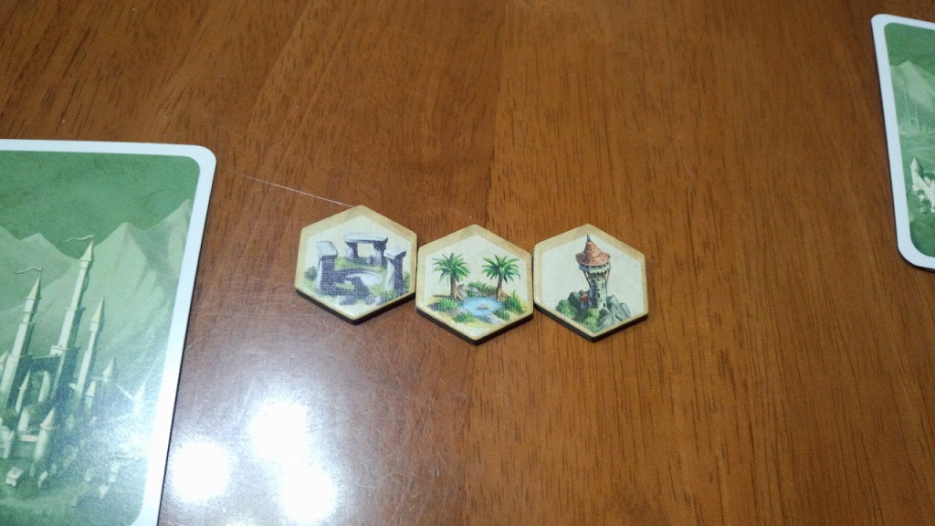 ボードには建物やオアシス・船等が書かれているヘクスがあるので、そこに対応したタイルを2枚ずつ置く。ちなみにここには駒は置けない。