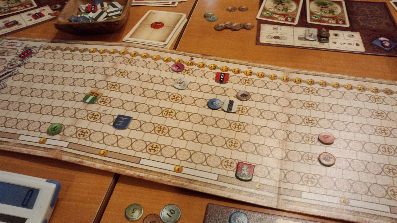 見た目と違って非常に軽いプレイ感で、3人プレイなら30分で終わる。手持ちのコマを1手番で3-5個ぐらい置いていくのでサクサク進むのだ。