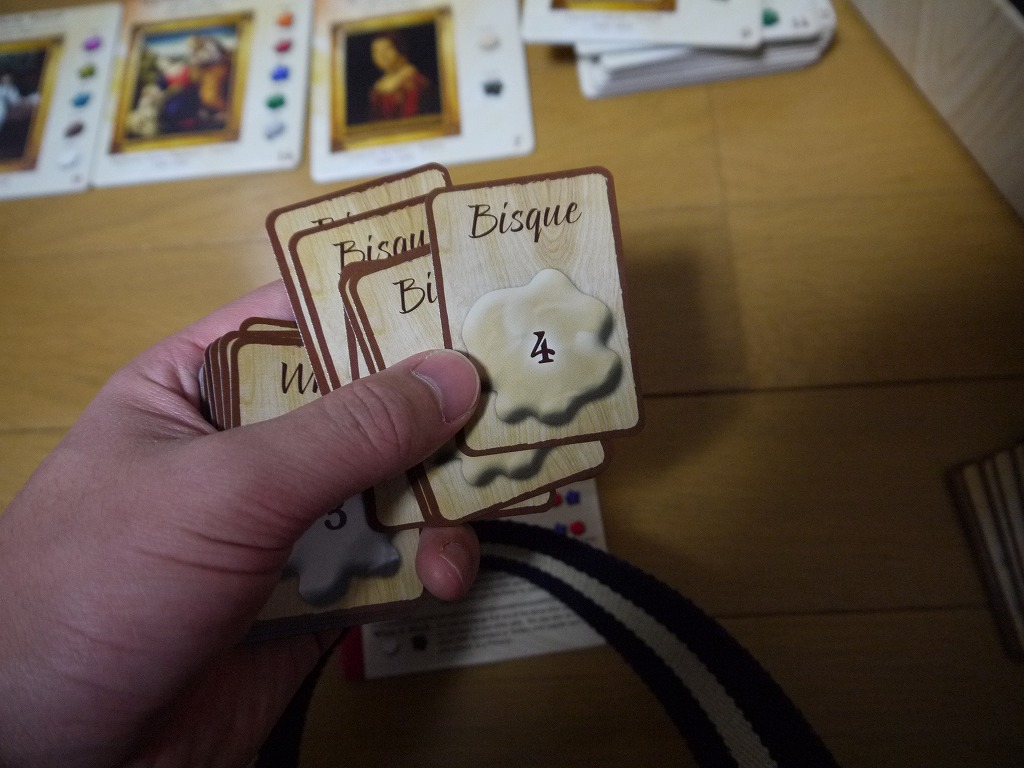 規定の点数を達成したプレイヤーが勝つとは限らないのがこのゲームの面白いところ。同じ画家の絵を2枚完成させていると「画家ボーナス」なる得点が加算され、また手元に残った色カードは、書かれている数字が得点となります。
