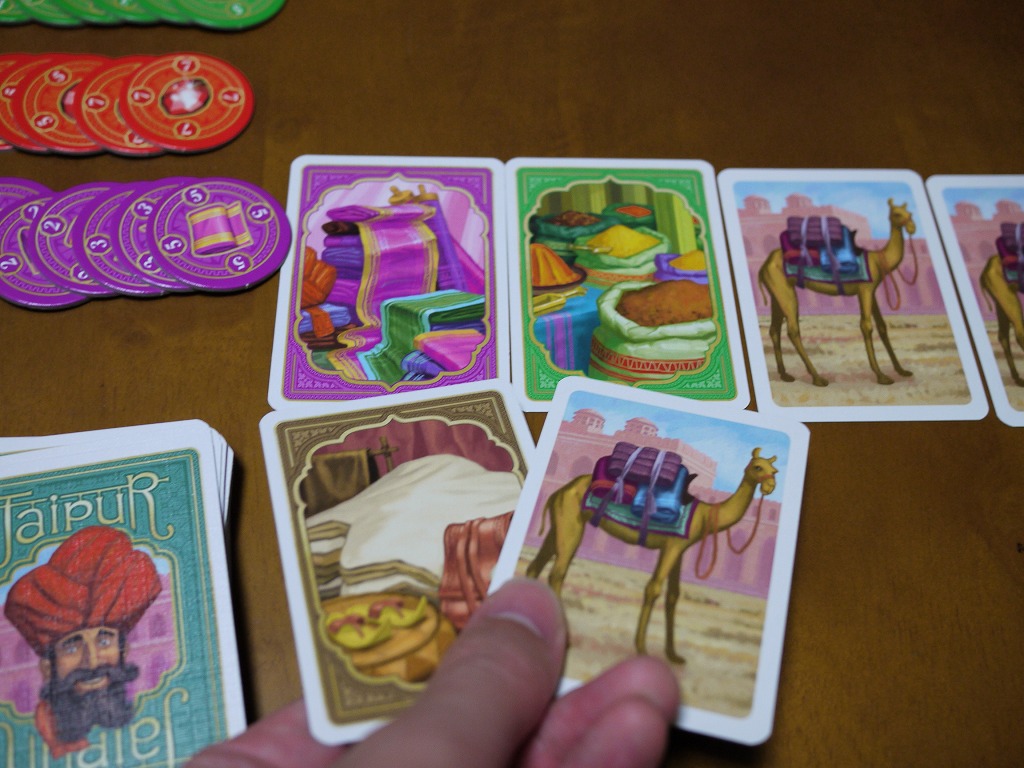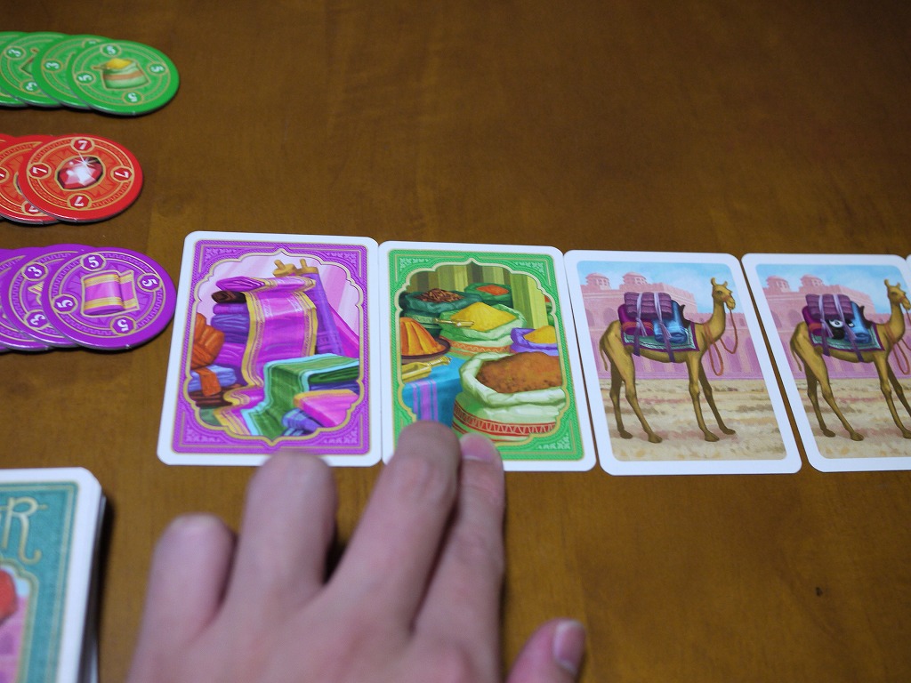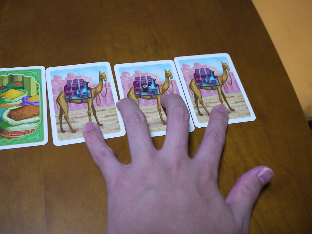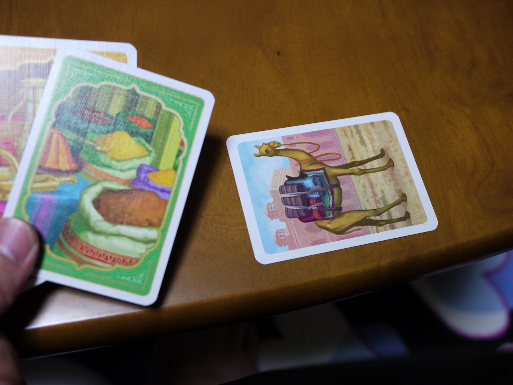 このとき、らくだを交換材料にしてもOK。ただ、交換した結果商品が7枚以上になるようなトレードはできない。らくだを手札に数えないというルールが、非常に手札のマネージメントを悩ましくしている。