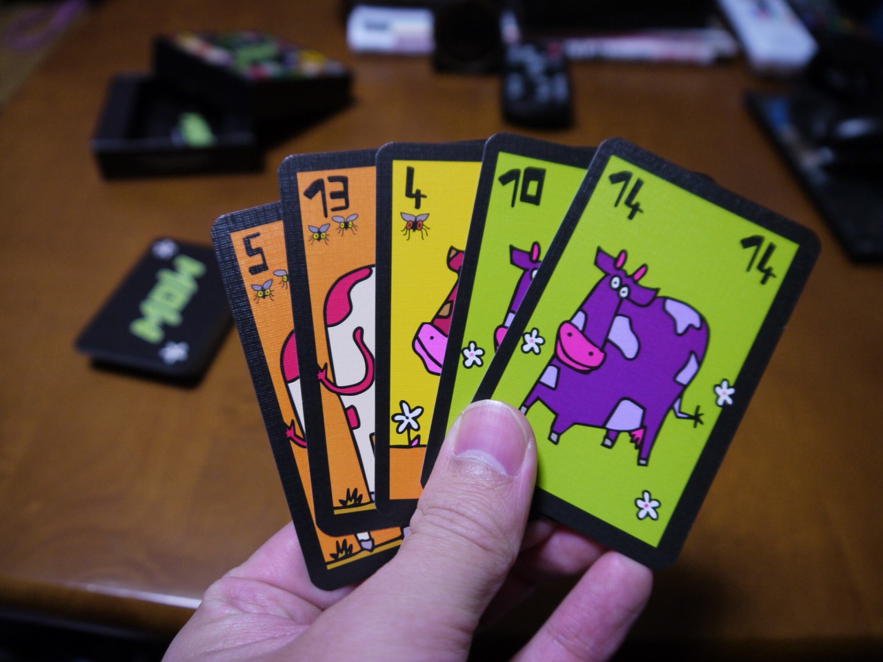 ニムトと違い、特殊カードがある。7と9に重ねて出せる曲芸牛、数字が連続していない場合に、間に割り込める牛がいる。