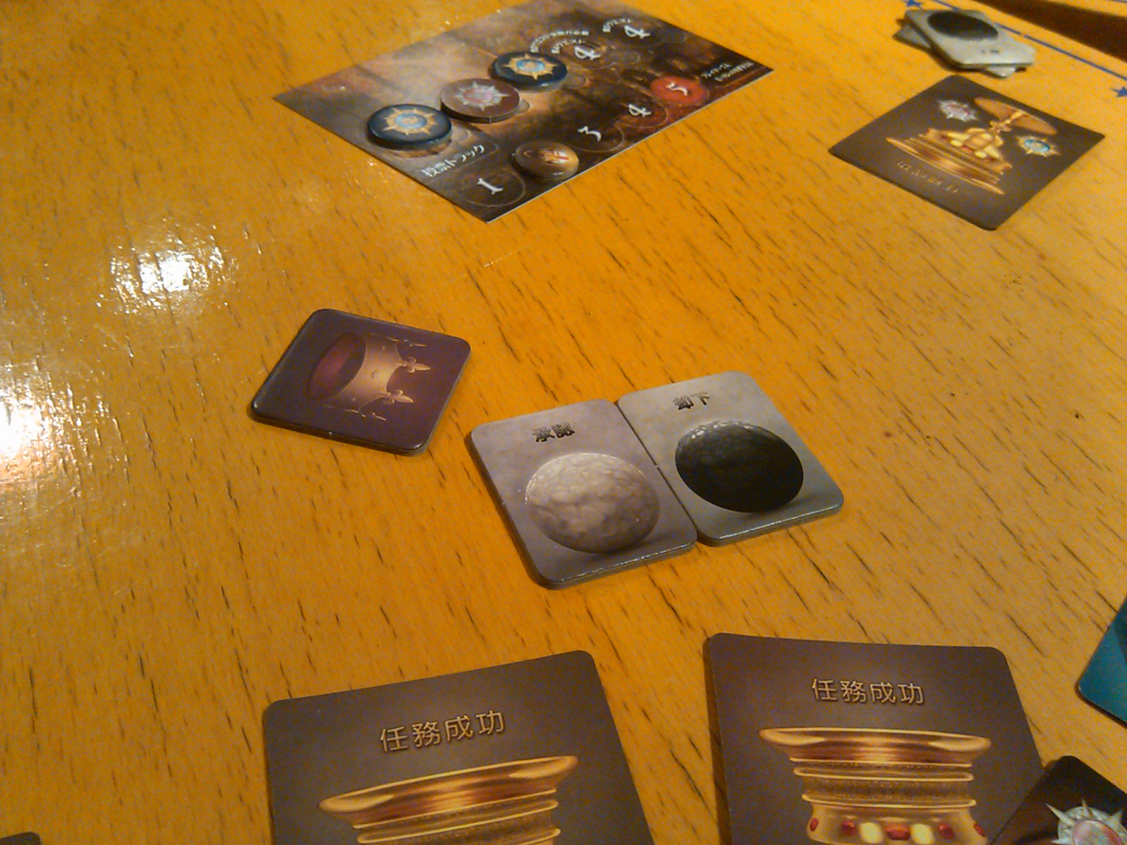 ゲームの信仰としては、まず手番プレイヤーが一緒に聖杯を探しに行く人を選ぶ。最初は2人選び、選ばれた人は成功/失敗のどちらかのカードを出す。円卓の騎士は必ず成功を出すが、悪の手下はどちらを出しても良い。最初の聖杯探索は2人しか選ばれないので、悪の手下が探索に言ったとしても「成功」カードを出しとくのが無難かな。「失敗」を出すと手番プレイヤーには正体がバレるからね。