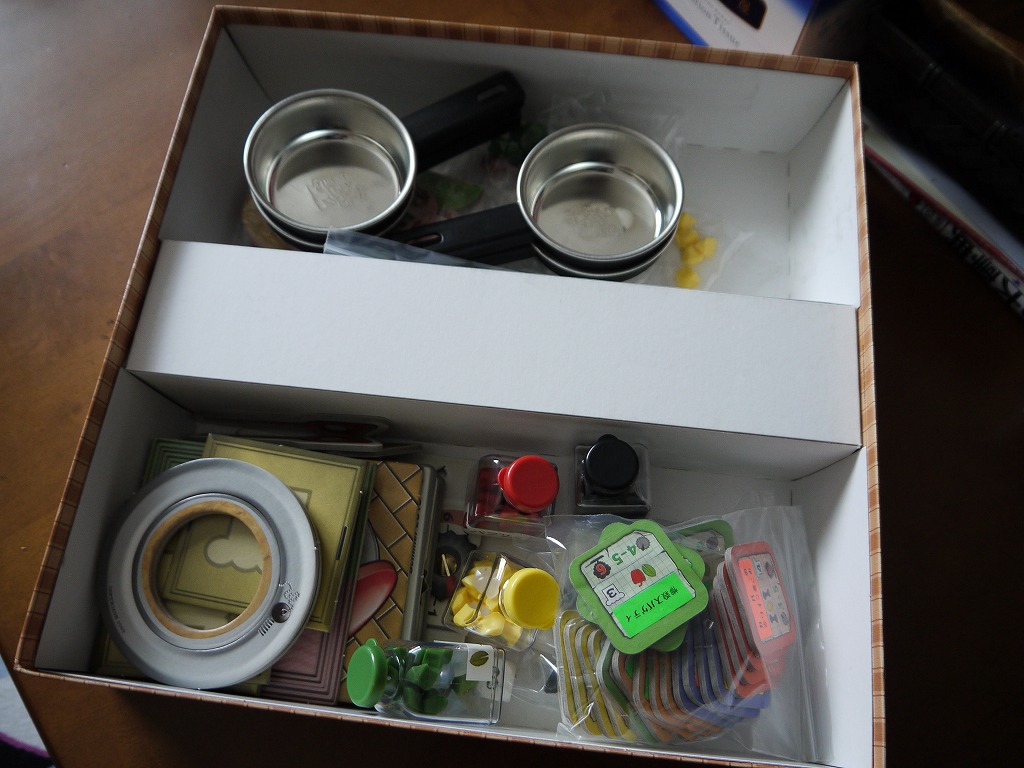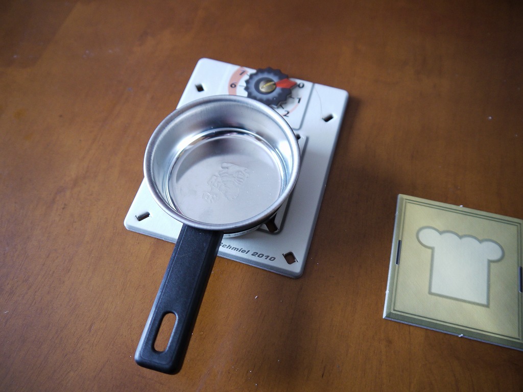 新板のルールでしかプレイしていないのでそちらで解説。まずは全員が「鍋」「コンロ」「できた料理を載せる皿」を受けとります。