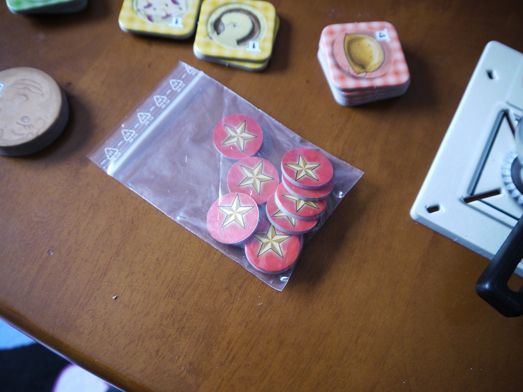 こうして料理が完成したら、めでたく自分の完成品としてお皿に置き、得点となります。(一手番内で完成させなくても、次の手番に持ち越せる)