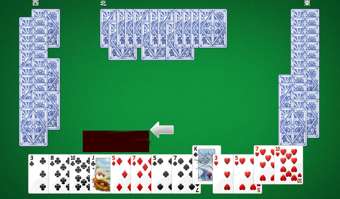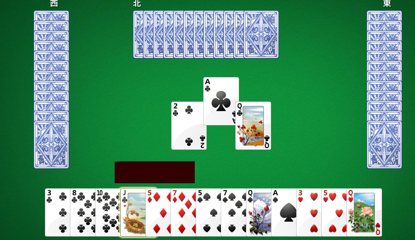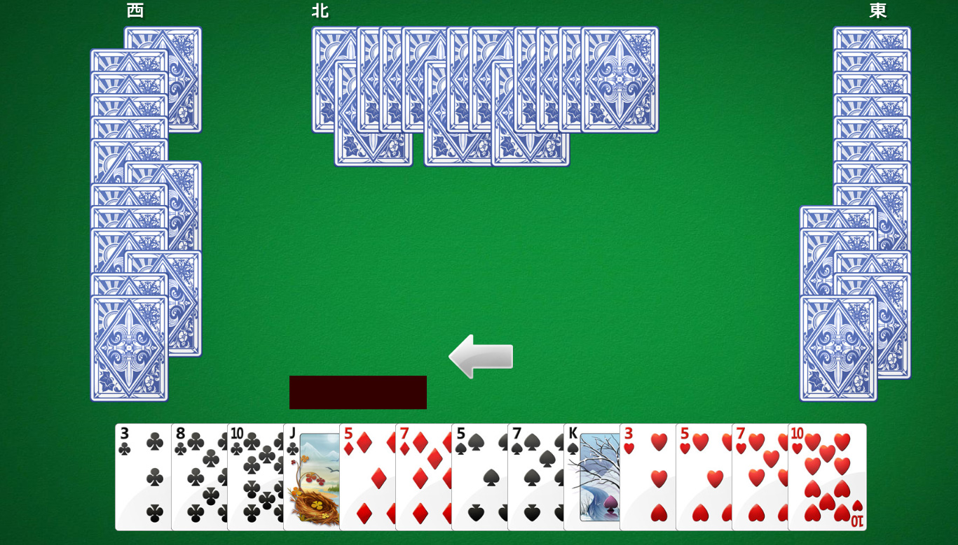 最初の人がクラブを出したら、次の人はクラブを出さなくてはならない。強弱は選べるが、スートはクラブだけ。