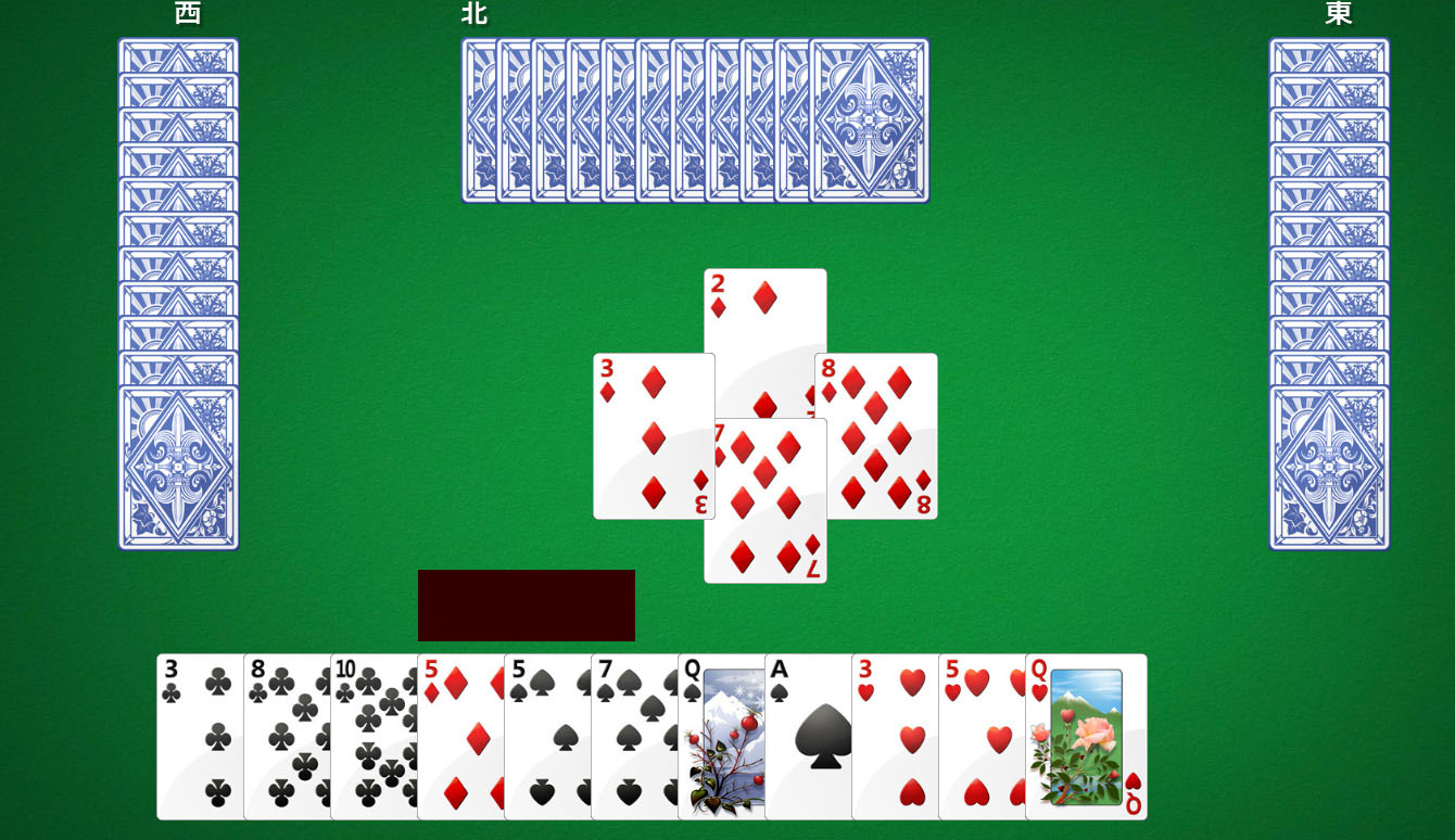人間相手だと、自分が最初に渡した3枚のカードを覚えているので、そのカードを読み合いながらやる楽しいゲームになるはず。麻雀はやたら時間がかかるので、そこまで時間が取れない時にもオススメ。1ラウンドなら15分でできる。